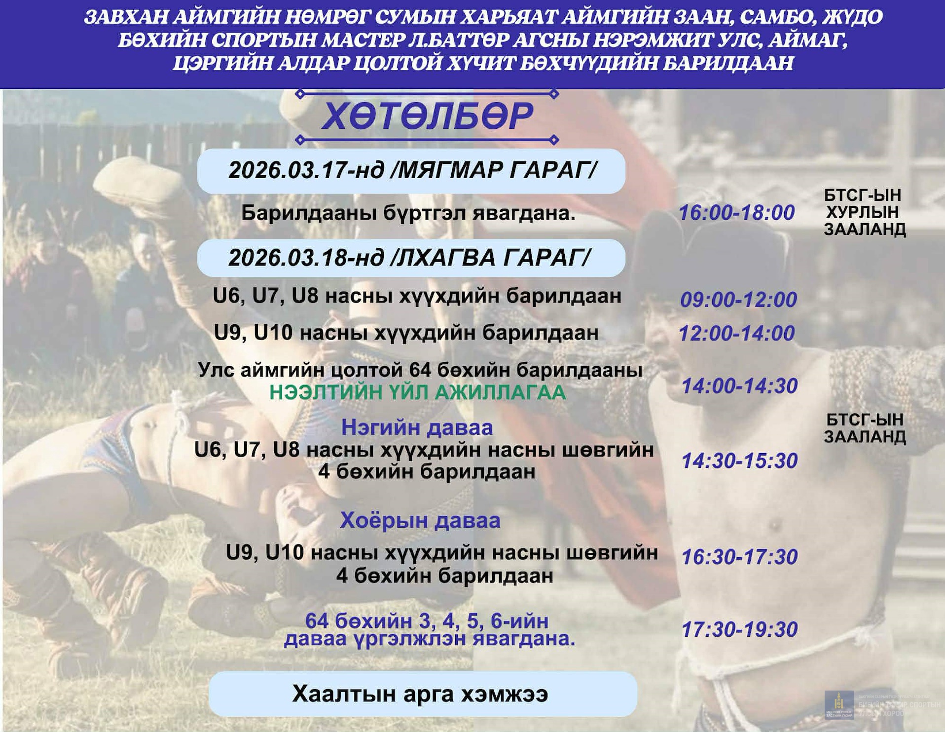 Завхан аймгийн Нөмрөг сумын уугуул, Ардын хувьсгалын 74 жилийн ой, аймгийн баяр наадмын үзүүр бөх, бөхийн самбо, жүдо барилдааны спортын мастер, багш, дасгалжуулагч, өмсөх мэхээрээ түмэн олноо танигдан алдаршсан аймгийн заан Лхагваагийн БАТТӨР агсны нэрэмжит улс, аймгийн алдар цолтой хүчит бөхийн барилдаан 3-р сарын 18-нд Завхан аймагт зохион байгуулагдана.