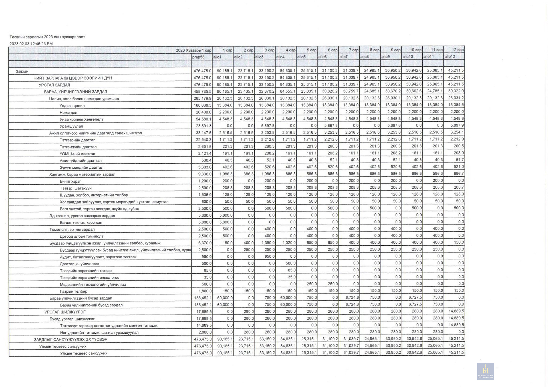 2023 оны төсвийн хуваарь